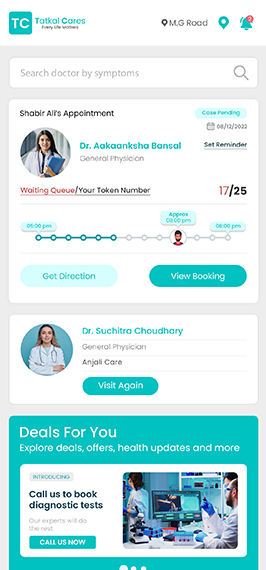The Tatkal Cares app has been designed to simplify your healthcare journey. You can track appointments token number on our mobile app from the comfort of your home and skip long queues with our Live Token system.